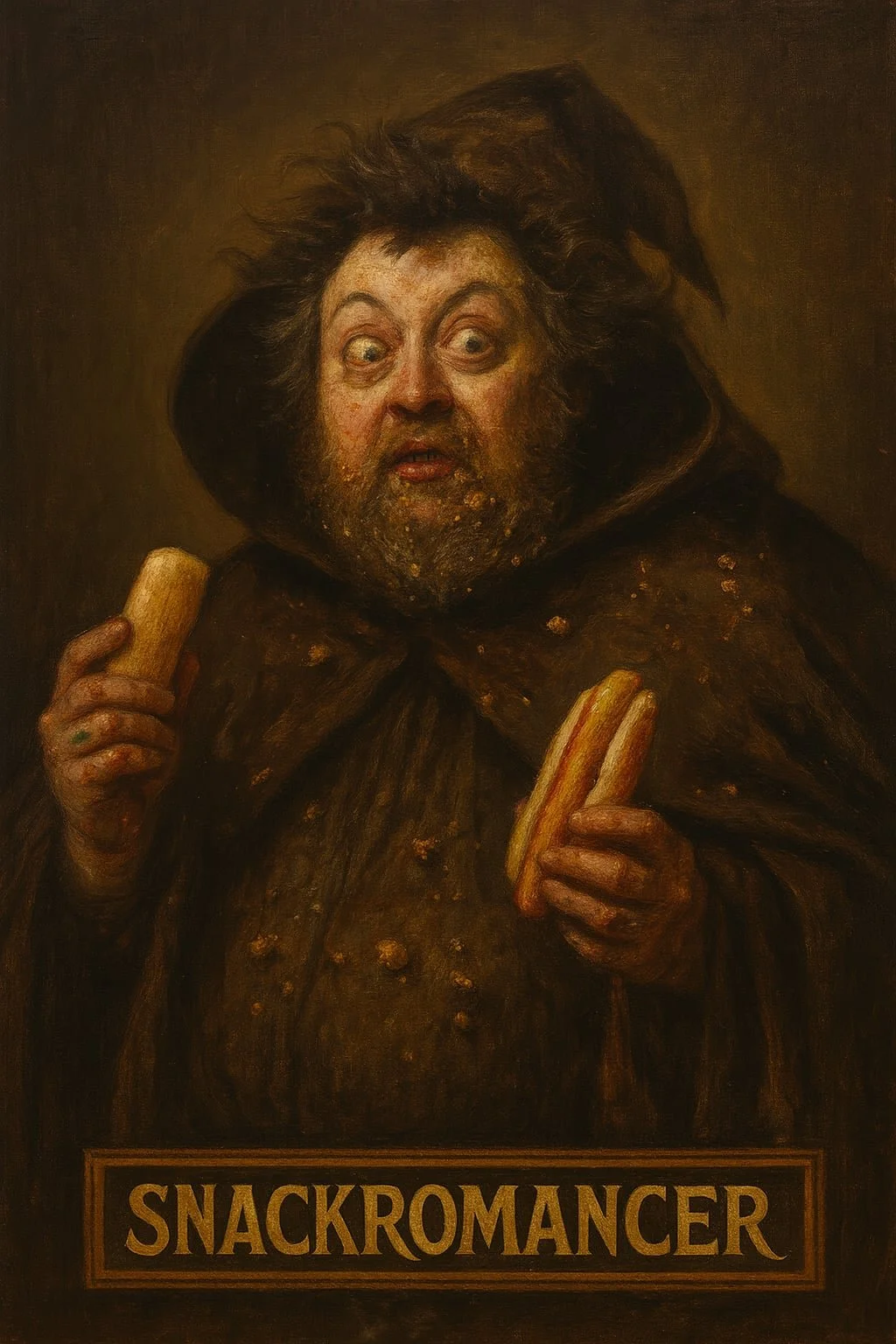 Yet even now, his journey is never quiet. For always behind him slinks The Snackromancer, an unholy meddler with a fondness for resurrecting expired ingredients and slipping his cursed rituals into sacred pages. Thus, The SAUCERER fights not just to preserve balance in the Flavor Realms… but to keep the Grimoire pure, potent, and mostly mayonnaise-free.